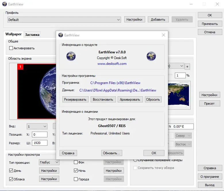 EarthView — это динамические обои и хранитель экрана, которые демонстрируют красочные и детализированные виды Земли в реальном времени. Программа способна отображать карту планеты с дневным и ночным освещением, облаками, атмосферными слоями и городскими огнями. Она поддерживает отображение более 140 000 городов по всему миру и позволяет настроить визуализацию для различных сценариев. Пользователи могут выбрать из множества карт и проекций, чтобы получить уникальный обзор нашей планеты в любой точке и в любое время суток.