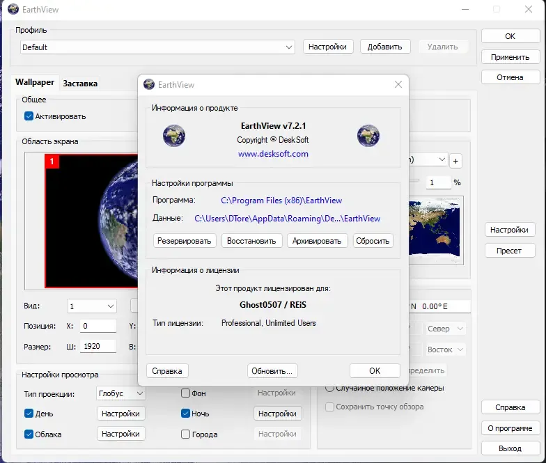 Программа предлагает богатый выбор карт и опций для полного контроля над отображением Земли.