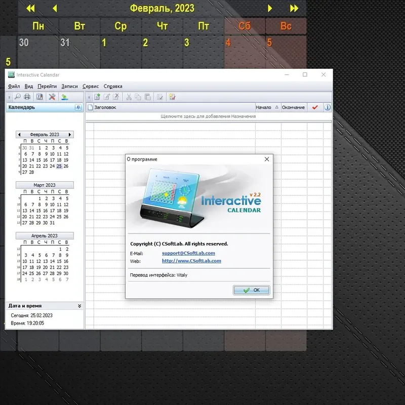 Interactive Calendar — это современный календарь и планировщик с возможностью персонализации, который позволяет пользователям легко управлять задачами и событиями. Он отлично подходит для тех, кто ценит удобство и функциональность в одном приложении. Программа предлагает расширенные настройки внешнего вида и функций, что делает ее привлекательной для разных категорий пользователей, включая тех, кто ищет надежное решение для организации семейных дел, учебных задач или работы. Благодаря приятному дизайну и поддержке современных эффектов прозрачности, интерфейс выглядит эстетично и не отвлекает от основной работы.