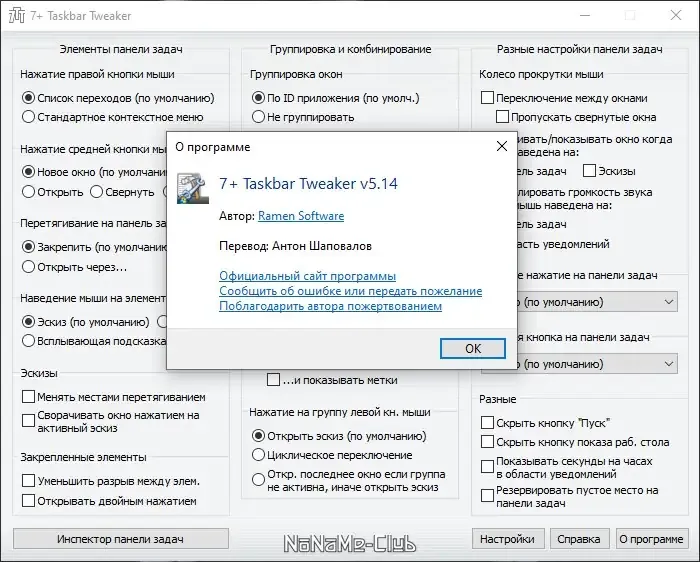 7+ Taskbar Tweaker — это универсальный инструмент для расширенной настройки панели задач. Он позволяет активировать функции, которые отсутствуют в стандартных редакциях Windows, а также добавляет новые опции, заимствованные из других операционных систем. В программе реализованы как основные настройки, так и экспертные параметры, что делает её подходящей как для обычных пользователей, так и для продвинутых специалистов. Программа предоставляет возможность визуально управлять группировкой окон, настраивать поведение элементов интерфейса и выполнять тонкую настройку панели задач для повышения удобства работы.