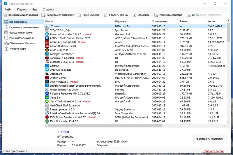 Absolute Uninstaller — это профессиональный инструмент для деинсталляции программ, который обеспечивает более эффективное удаление по сравнению со стандартными средствами Windows. Он способен находить и удалять даже те компоненты, которые обычно остаются после обычной деинсталляции, что делает его про- решением для поддержки чистоты системы и повышения её производительности. Программа обладает быстрым запуском, удобной навигацией и широкими возможностями для управления установленным софтом, что делает её популярным выбором среди пользователей, желающих иметь под контролем все установленные приложения.