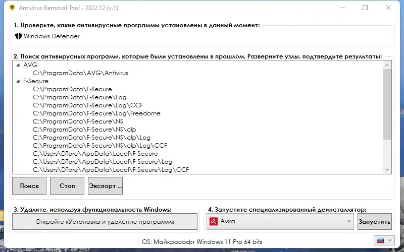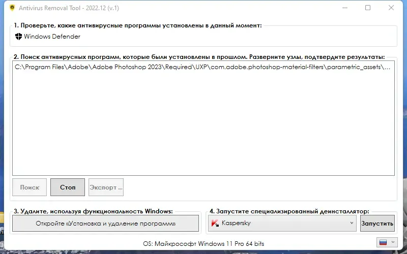 - Автоматическое обнаружение установленного антивируса и предложение вариантов удаления.