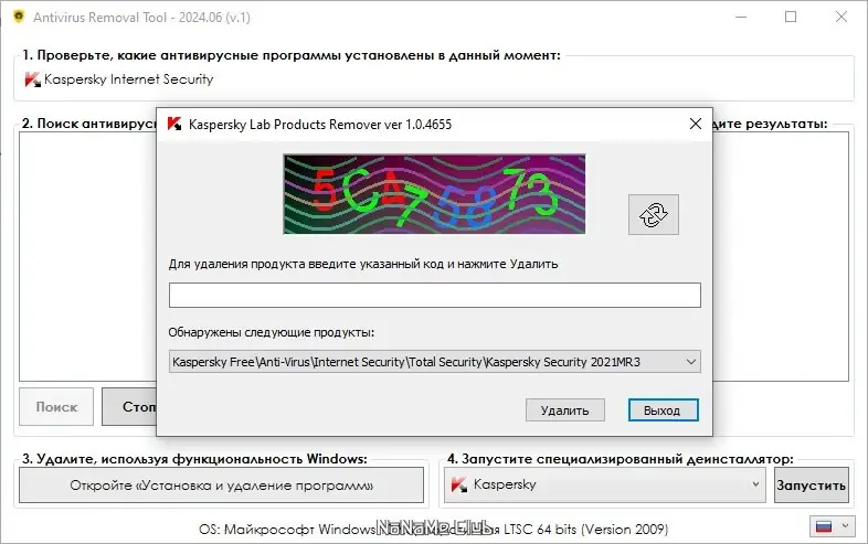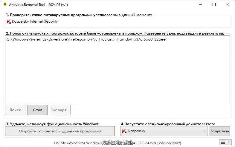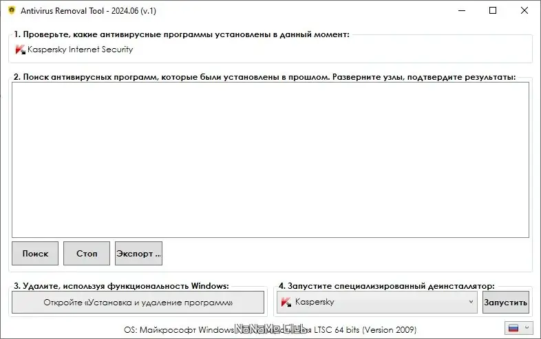 Для использования программы достаточно запустить её на компьютере, после чего автоматически начнется сканирование системы на наличие установленных антивирусных решений. В графической оболочке будет отображён список обнаруженных программ, среди которых может быть и Kaspersky. Пользователь выбирает нужный антивирус и нажимает кнопку для запуска официальной утилиты удаления. После завершения процесса рекомендуется перезагрузить компьютер для полной очистки системы. В случае необходимости можно выполнить дополнительное сканирование на наличие остатков программ безопасности и удалить их вручную.