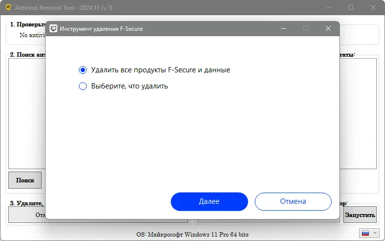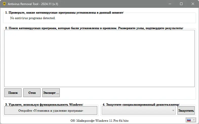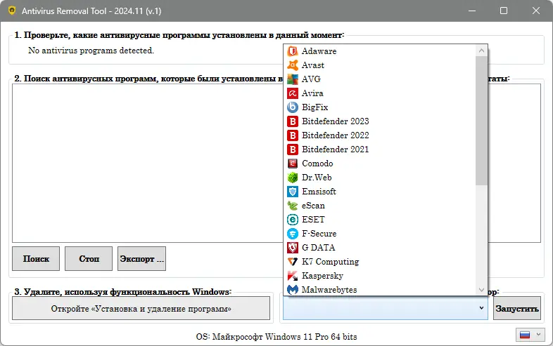 Antivirus Removal Tool — это портативный набор официальных утилит, предназначенных для полного удаления различных антивирусных программ с компьютера. Этот сборник обладает удобной графической оболочкой, которая автоматически определяет установленный антивирус и предлагает запустить соответствующую утилиту для его удаления. Кроме того, программа позволяет просканировать систему на наличие остатков удалённых антивирусов и выполнить дополнительные процедуры очистки, что обеспечивает более эффективную деинсталляцию и предотвращает возможные конфликты. Antivirus Removal Tool подходит для быстрого устранения нежелательного программного обеспечения и улучшения безопасности системы без необходимости установки дополнительного софта.