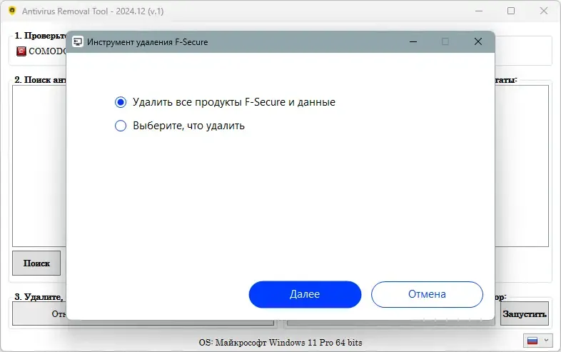 - Автоматическое определение установленного антивируса и быстрый запуск удаления.