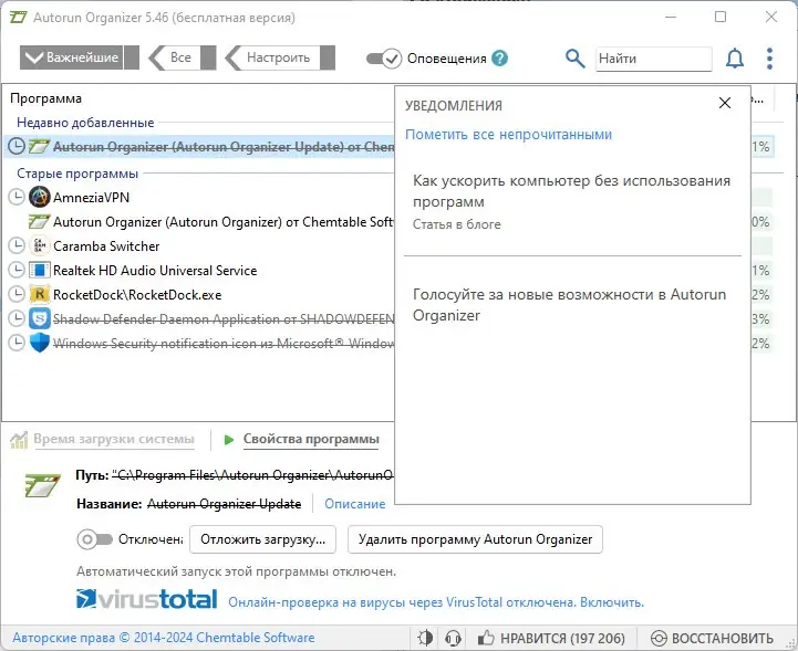 Autorun Organizer — это надежный менеджер автозагрузки, который дает пользователю полный контроль над программами, автоматически стартующими при включении компьютера. Он позволяет просматривать список запущенных приложений, их свойства, а также управлять ими, чтобы оптимизировать работу системы. Программа подходит для пользователей, желающих повысить скорость загрузки и обеспечить безопасность своего ПК. Скачать Autorun Organizer можно на официальном сайте или в популярных источниках, предоставляющих бесплатное программное обеспечение.