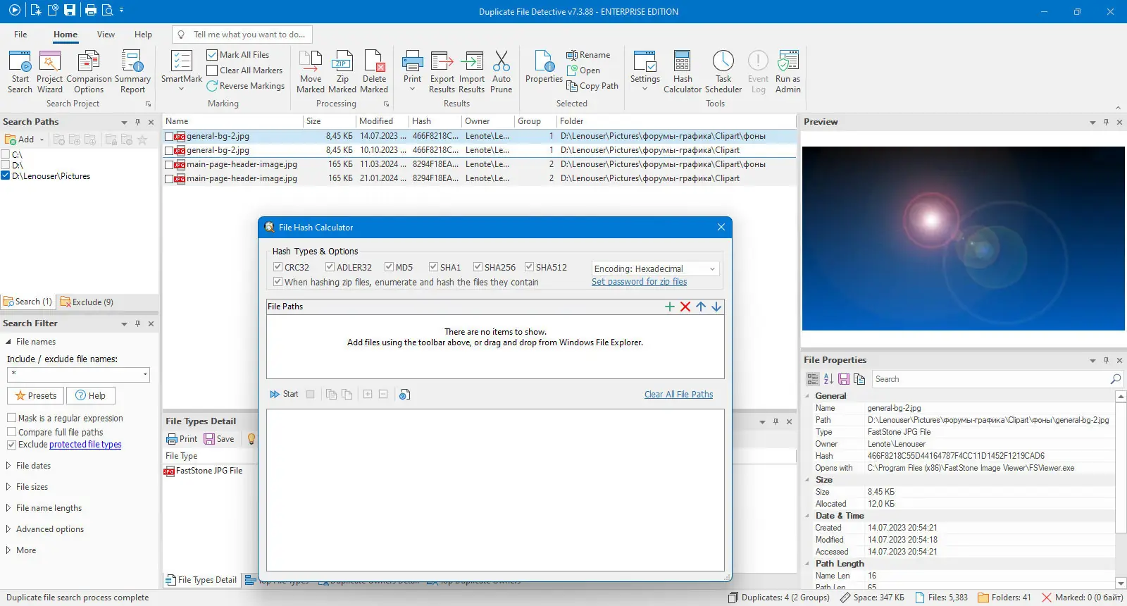 Duplicate File Detective — это мощная программа для поиска и устранения дублирующихся файлов на жестких дисках, съемных носителях и сетевых ресурсах. Используя современные алгоритмы анализа содержимого и хэширования, она помогает освободить место, ускорить резервное копирование и повысить порядок в файловых системах. Инструмент подходит как для индивидуальных пользователей, так и для корпоративных клиентов, обеспечивая быстрый и безопасный процесс управления дубликатами.
