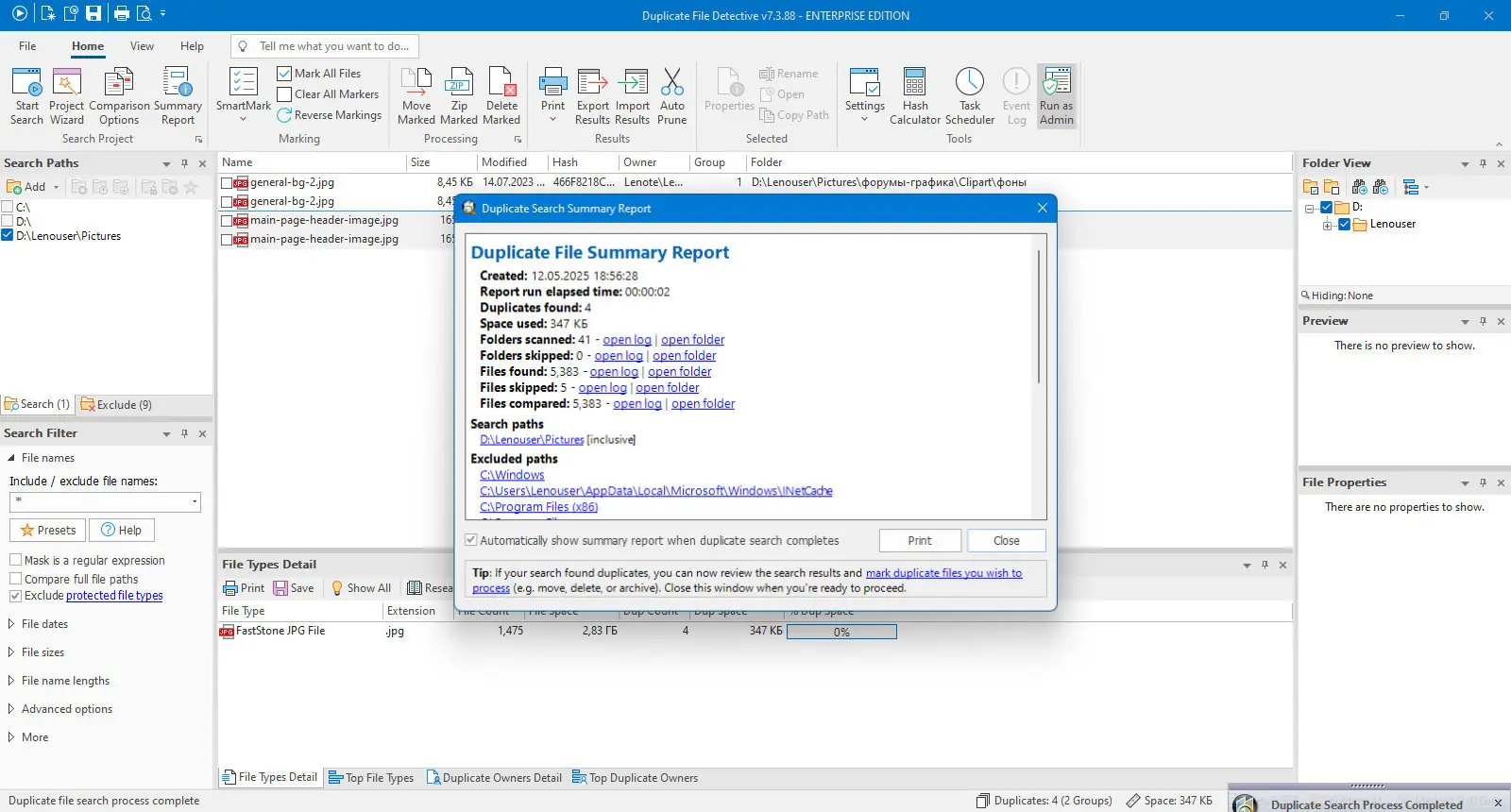 Duplicate File Detective — это универсальное решение для поиска и удаления одинаковых файлов с помощью точного сравнения по содержимому. Программа особенно эффективна при работе с большими объемами данных, позволяя автоматизировать рутинные задачи и минимизировать риск ошибок. Благодаря богатому функционалу, она обеспечивает комплексный подход к управлению файлами, помогая снизить затраты времени и ресурсов.