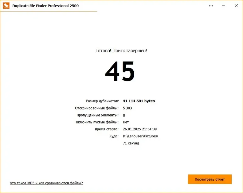 - Высокая скорость поиска дубликатов благодаря алгоритму MD5.