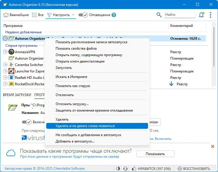 - Управление пунктами меню, созданными другими программами