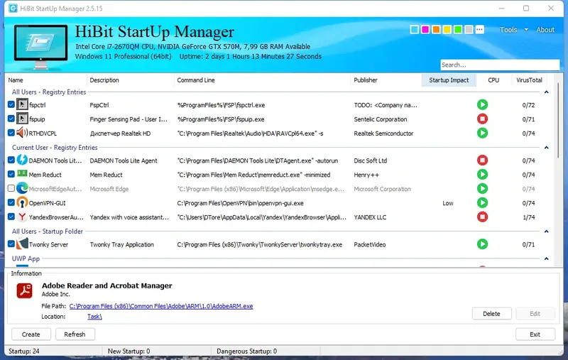 HiBit Startup Manager — это мощное программное обеспечение для оптимизации и управления запуском приложений на компьютере с Windows. Оно позволяет пользователям контролировать список автозагрузки, повышая производительность системы и обеспечивая безопасность. Программа подходит как для опытных пользователей, так и для новичков, которые хотят ускорить работу своего ПК и устранить возможные проблемы, связанные с запуском приложений.