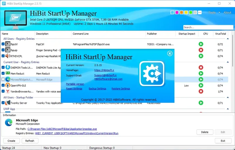 HiBit Startup Manager — это универсальное решение для управления списком программ, автоматически загружающихся при стартовом запуске Windows. Оно обеспечивает удобное добавление, редактирование и отключение приложений, что способствует ускорению загрузки системы и снижению нагрузки на ресурсы. Благодаря интуитивно понятному интерфейсу и множеству функций, программа позволяет повысить безопасность системы и устранить раздражающие сообщения об ошибках во время загрузки.
