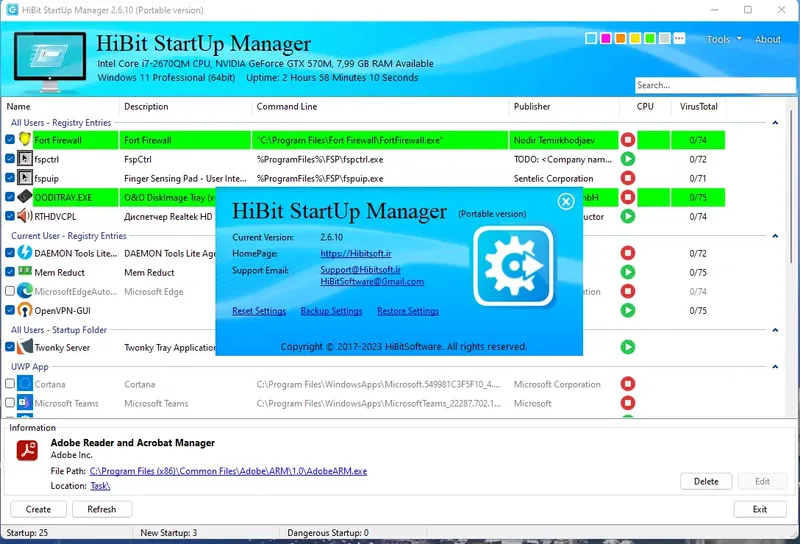 HiBit Startup Manager — это универсальный инструмент для управления списком приложений и служб, которые автоматически запускаются при включении Windows. Он помогает ускорить загрузку системы, устранить ошибки и повысить безопасность за счет мониторинга процессов. Программа идеально подходит для пользователей, желающих повысить производительность и стабильность работы своего компьютера, а также для системных администраторов, нуждающихся в удобном управлении службами и задачами.