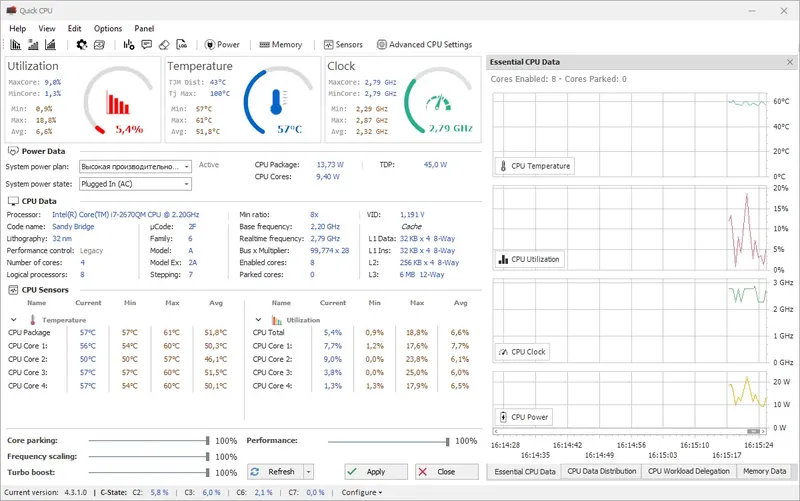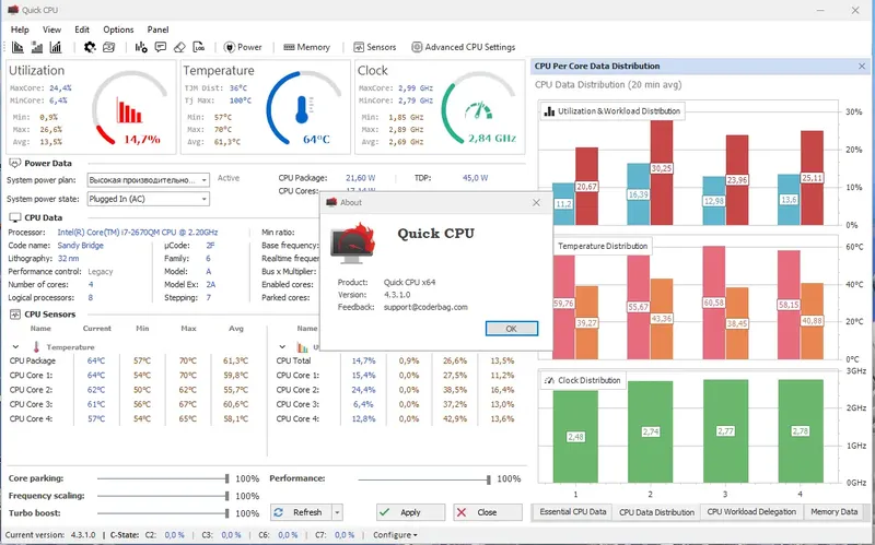 Quick CPU — это официальный инструмент, предназначенный для тонкой настройки и тестирования процессора в операционной системе Windows. Он позволяет пользователю регулировать такие параметры, как частота, Turbo Boost, C-States, Speed Shift, FIVR Контроль и парковка ядер, что делает его незаменимым для энтузиастов разгона и системных администраторов. Программа поддерживает работу с 64-битными системами (x64), что обеспечивает высокую производительность и стабильность при использовании современных процессоров.