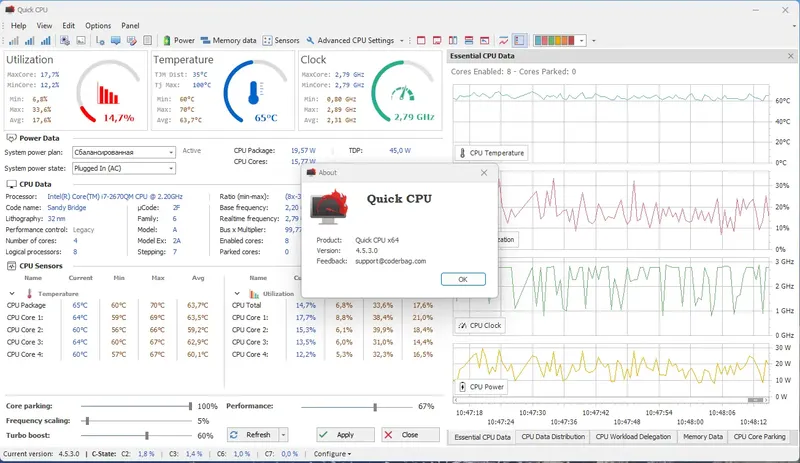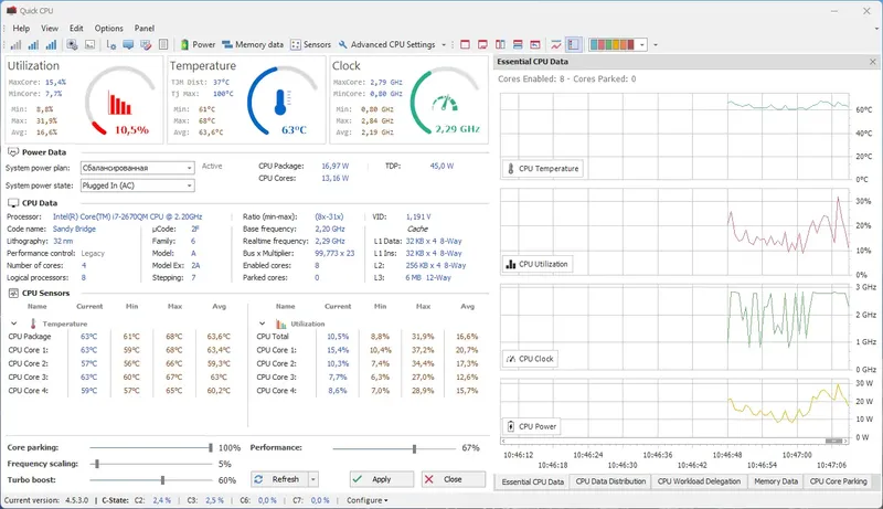 Quick CPU — это универсальный инструмент, предназначенный для настройки и тестирования процессора и системы в целом. Он поддерживает 64-битную архитектуру (x64), что обеспечивает стабильную работу на современных операционных системах. Благодаря удобному интерфейсу и широкому функционалу, программа позволяет контролировать параметры производительности и энергосбережения, а также выполнять разгон процессора для повышения его мощности. Важной особенностью является возможность применения изменений на лету, без необходимости перезагрузки системы, что значительно ускоряет процесс оптимизации.