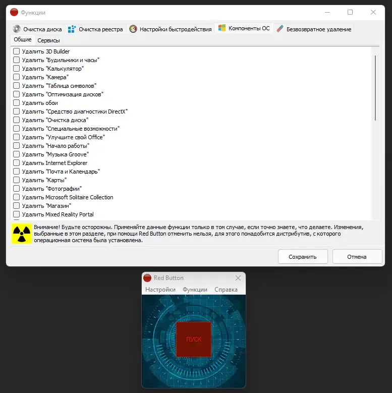 Red Button — это мощный инструмент, который помогает управлять системными компонентами, удалять ненужные файлы и настраивать параметры Windows. Она поддерживает все актуальные версии Windows, начиная с XP и заканчивая Windows 11, что делает её универсальным решением для любого пользователя. В рамках программы реализованы сотни функций, включая отключение службы, исправление ошибок реестра, очистку временных файлов и настройку приватности.