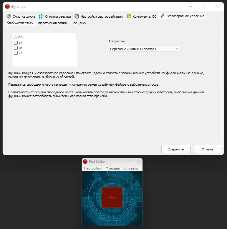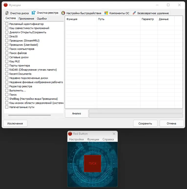 Red Button — это универсальная утилита для оптимизации и очистки операционной системы Windows. Она позволяет повысить производительность компьютера, освободить место на диске и обеспечить безопасность данных. Благодаря широкому набору функций, программа подходит как для домашних пользователей, так и для профессиональных специалистов.