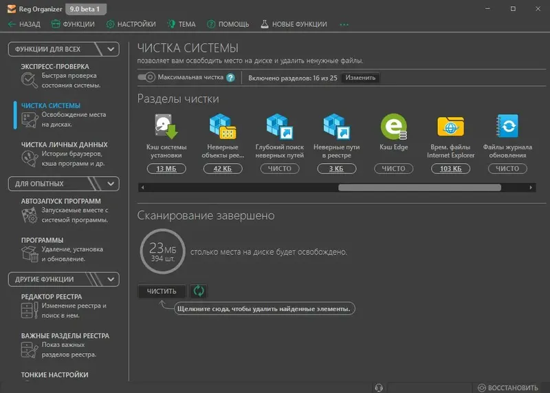 - Глубокий поиск и автоматическая очистка ошибок в реестре