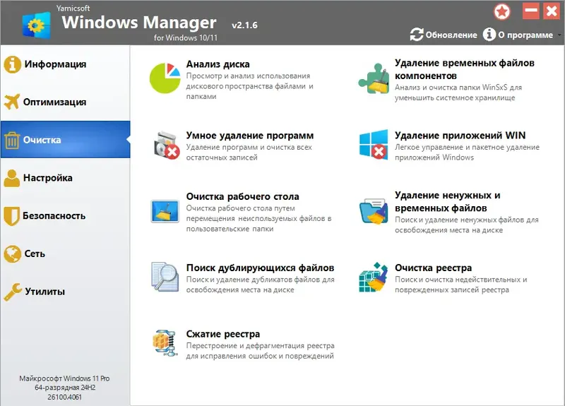 Manager — универсальная программа для оптимизации, настройки, ремонта и очистки систем Windows 10/11. Эта мощная утилита объединяет более сорока инструментов, позволяющих повысить производительность, устранить ошибки, обеспечить безопасность и персонализировать ваш компьютер. Благодаря простому интерфейсу, программа подходит как опытным пользователям, так и новичкам, желающим быстро улучшить работу системы.