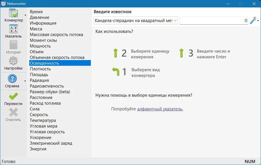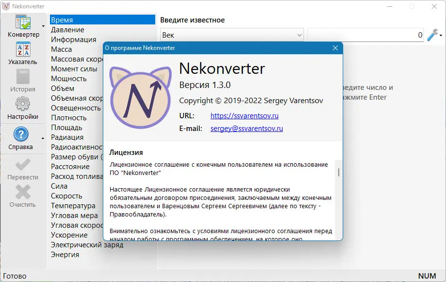 Nekonverter — это универсальный конвертер для Windows, предназначенный для перевода значений между более чем 260 единицами измерения в 24 категориях. Он подходит для профессионалов и любителей, которым необходимо быстро выполнять расчетные операции в области физики, техники, энергетики, геодезии и других областях. Благодаря расширяемому списку величин и возможностям настройки, программа позволяет адаптировать ее под любые задачи, связанные с измерениями и расчетами.