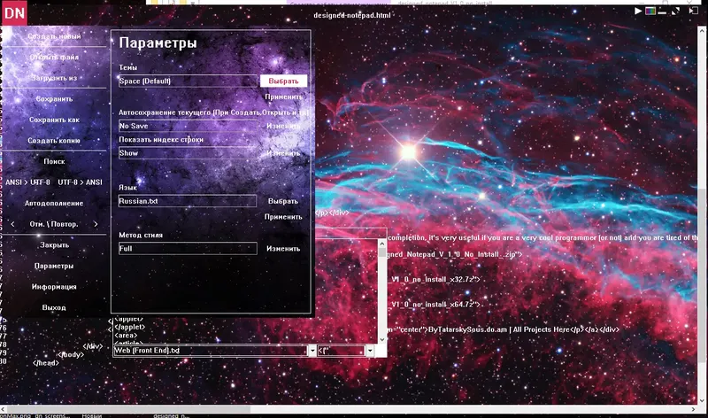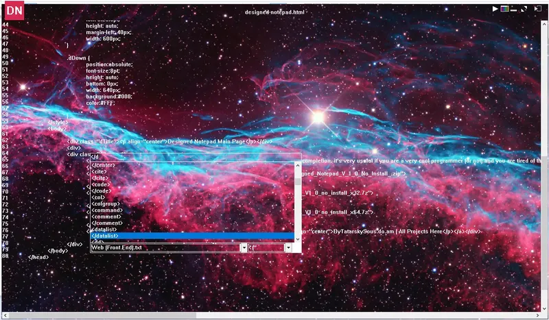 Designed Notepad — это инновационный текстовый редактор, созданный для программистов и разработчиков, которым важны гибкость и расширяемость. В отличие от стандартных редакторов, он позволяет использовать изображения и анимацию (*.gif) вместо фона, что делает рабочий процесс более визуально привлекательным и индивидуальным. Программа обладает рядом уникальных функций, таких как настройка автодополнения, возможность добавления собственных конструкций и интеграция с системными командами, что значительно повышает продуктивность при написании кода.