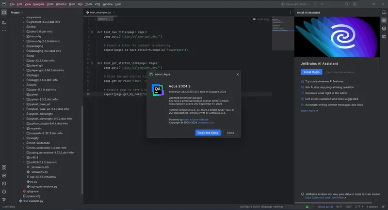 JetBrains Aqua — это новая интегрированная среда разработки, ориентированная на автоматизацию тестирования. Она отличается уникальной поддержкой языков программирования, таких как Java, Python, JavaScript, TypeScript, Kotlin и SQL, а также интеграцией с фреймворками Selenium, Playwright и Cypress. Aqua предлагает специализированный интерфейс, который помогает тестировщикам быстро создавать и управлять автоматизированными сценариями, снижая время на настройку и повышая качество тестирования. Благодаря использованию AI для генерации тестов и моделирования страниц, эта IDE значительно ускоряет процессы разработки тестовых сценариев и обеспечивает более стабильные результаты.