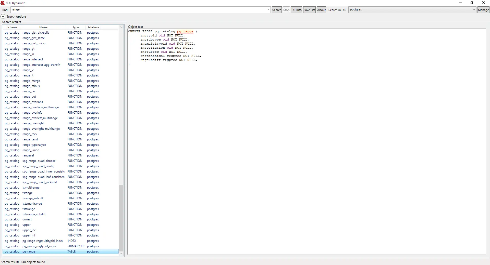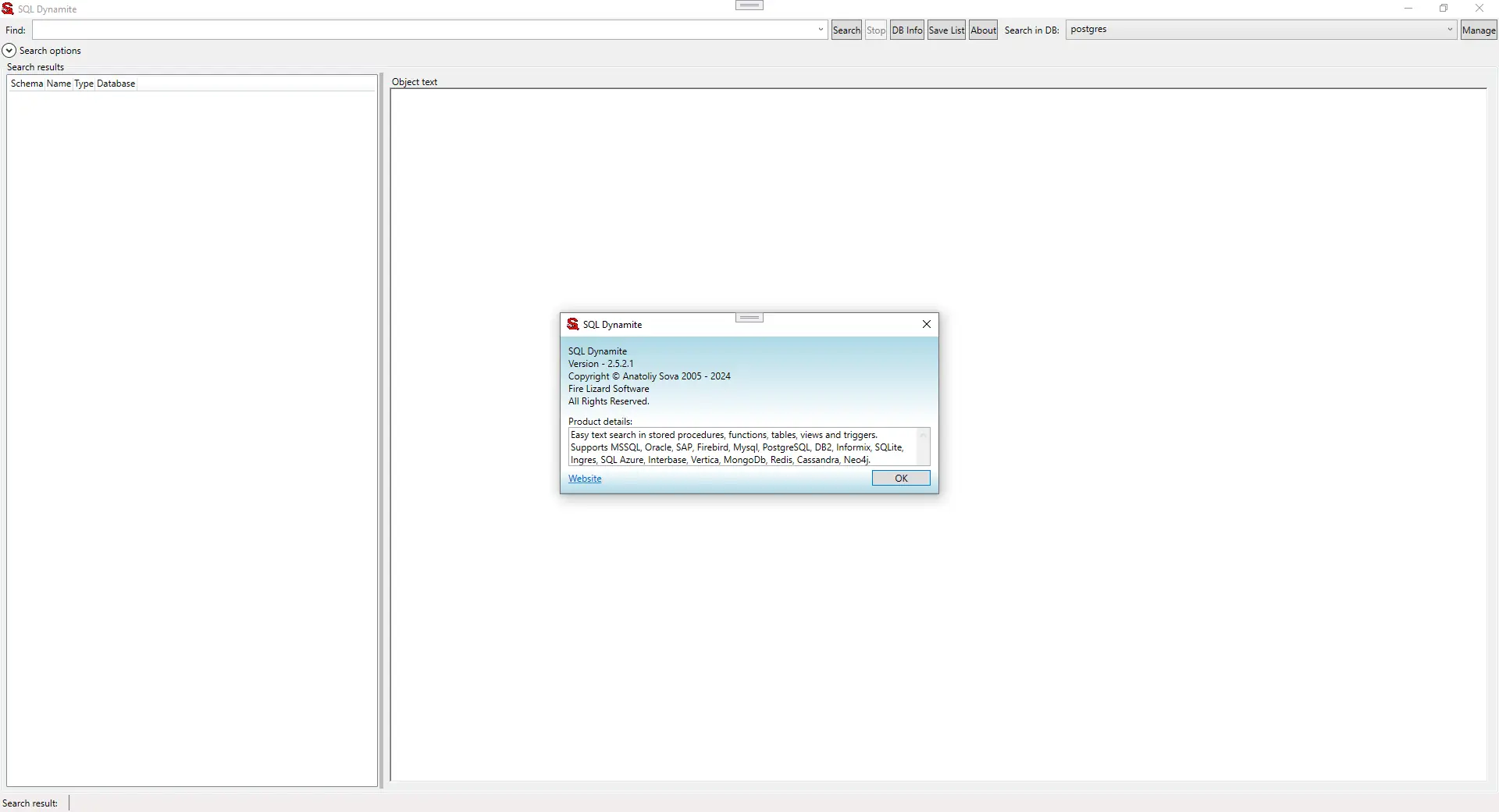 SQL Dynamite — мощное программное обеспечение для поиска и анализа объектов баз данных различных типов. Оно позволяет быстро находить нужные функции, хранимые процедуры, триггеры, представления, таблицы, индексы и другие элементы по их именам или содержимому. В программе реализована возможность поиска с учетом или без учета регистра, что значительно ускоряет работу с большими базами данных и разнообразными системами управления данными. Это решение подходит для разработчиков, администраторов и аналитиков, которым необходимо быстро находить и управлять объектами в различных СУБД.