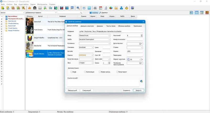 Music Collection — это универсальный проигрыватель и менеджер для создания и организации вашей музыкальной коллекции. Он позволяет удобно хранить, редактировать и просматривать информацию о композициях, альбомах и исполнителях. Благодаря возможности автоматической загрузки данных из интернета и гибкому поиску, программа значительно упрощает управление музыкальными файлами, делая процесс максимально комфортным и быстрым.
