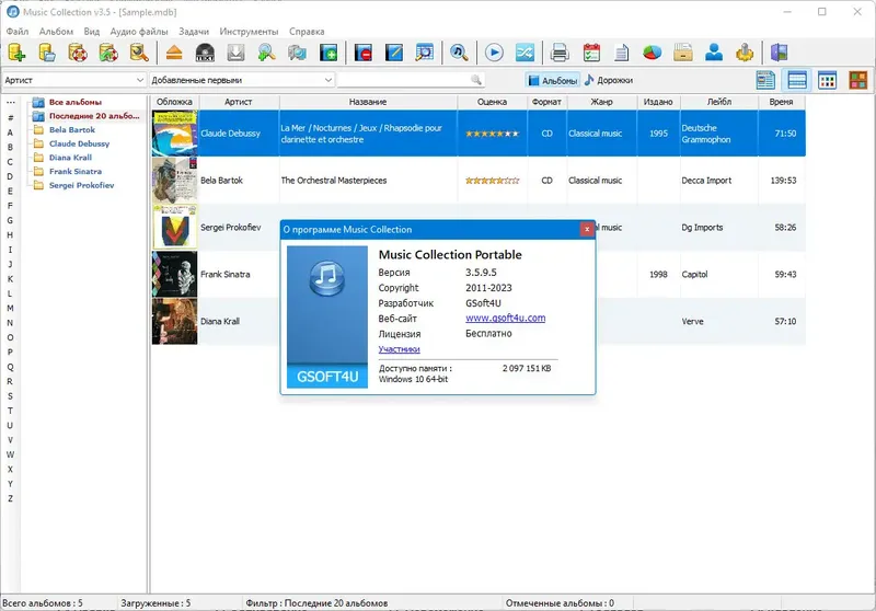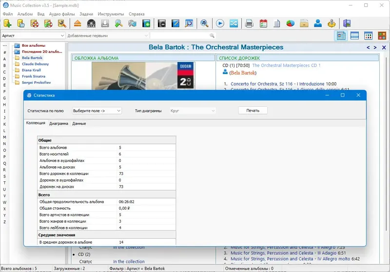 Music Collection — это универсальный проигрыватель и менеджер для создания собственной музыкальной библиотеки на компьютере. Он позволяет удобно организовать, редактировать и искать любимые композиции, делая прослушивание максимально комфортным. Благодаря интеграции с интернетом, программа автоматически загружает информацию о треках и альбомах, что значительно ускоряет работу и исключает ошибки. Это один из лучших инструментов для тех, кто ценит порядок в музыкальных коллекциях и хочет иметь полный контроль над своей музыкой.