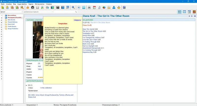 - Возможность сохранять дополнительную информацию о каждом альбоме, такую как тексты песен и дорожки.