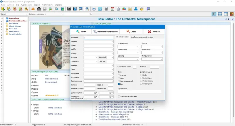 Music Collection — это лучший выбор для тех, кто ценит удобство и полноту информации о своей музыкальной библиотеке. В программе реализованы функции создания неограниченного числа коллекций, что позволяет организовать музыку по жанрам, настроениям или другим предпочтениям. Поддержка различных форматов файлов, таких как MP3, FLAC, WAV и другие, обеспечивает совместимость с любыми источниками аудио. Помимо этого, программа позволяет распознавать информацию даже с CD-дисков, что значительно ускоряет процесс пополнения коллекции. Визуальный интерфейс можно настроить по своему вкусу, выбрав один из 30 скинов, что обеспечивает индивидуальный стиль отображения.