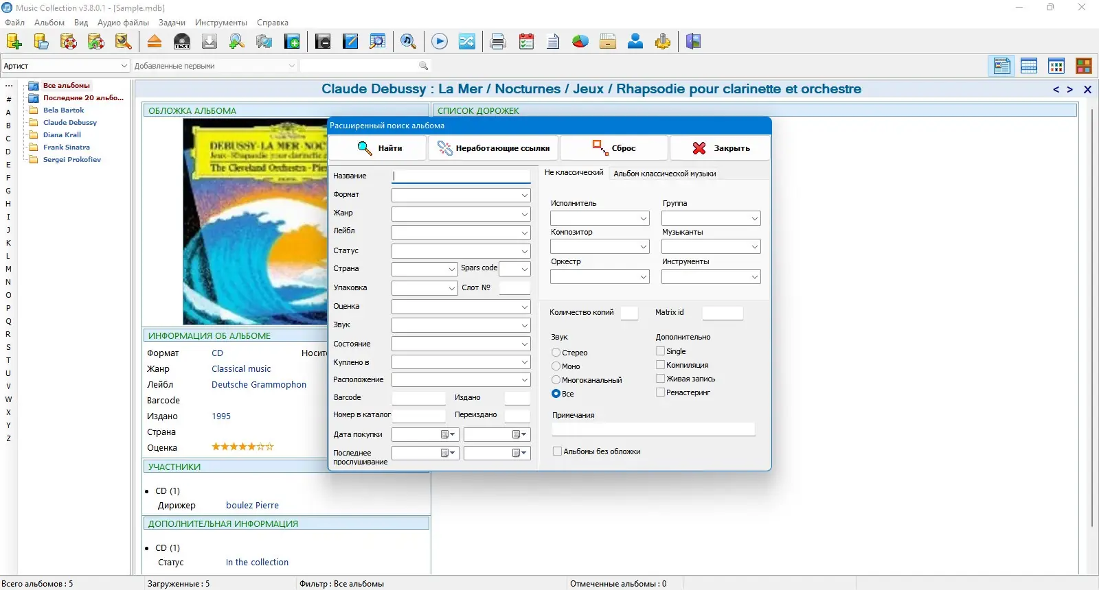 Music Collection обеспечивает полный контроль над музыкальной библиотекой, позволяя легко находить, редактировать и распечатывать информацию.