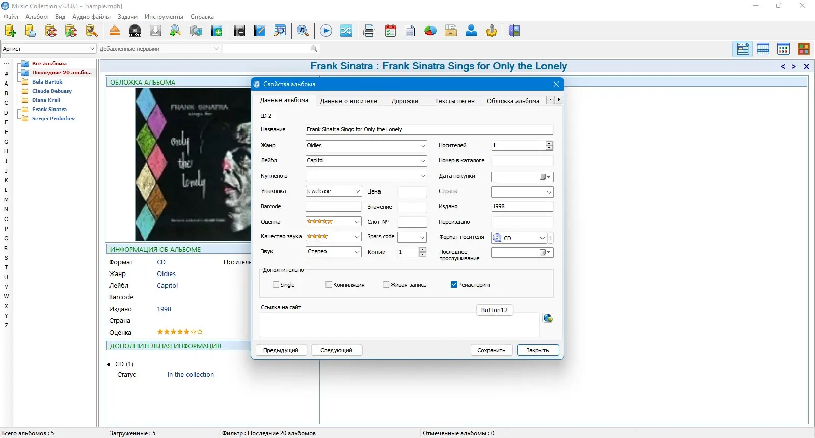 Music Collection — это универсальный проигрыватель и менеджер для создания и организации собственной музыкальной коллекции на компьютере. Программа позволяет удобно управлять файлами, редактировать информацию о композициях, а также загружать данные из интернета, что значительно упрощает работу с большим объемом музыки. Благодаря широким возможностям фильтрации и поиска, пользователь сможет легко найти нужный трек, альбом или исполнителя, а также распечатать список своей коллекции для удобства. Это лучший инструмент для тех, кто ценит порядок и хочет иметь полный контроль над своей музыкальной библиотекой.