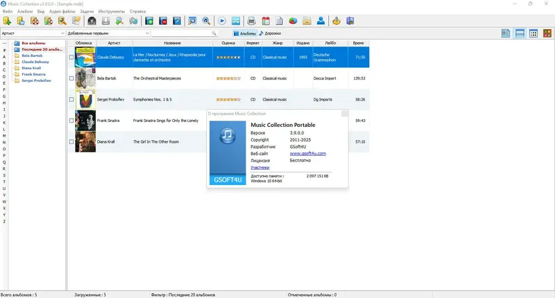 Music Collection — это мощный и универсальный инструмент для управления музыкальной библиотекой с множеством полезных функций. Он позволяет создавать структурированные базы данных, поддерживает разнообразные форматы файлов и обеспечивает быстрый поиск по различным критериям. Кроме того, программа обладает возможностью загрузки информации из интернета, что значительно упрощает работу с большим количеством треков. Важной особенностью является возможность настройки внешнего вида программы и экспорт данных для публикации.