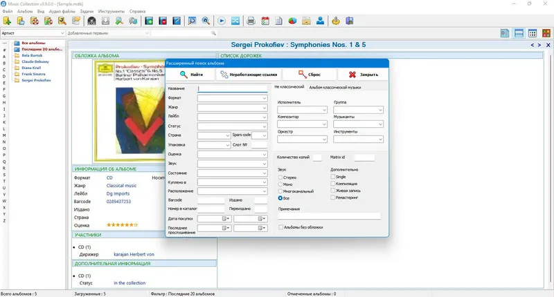 Music Collection — это лучший выбор для тех, кто хочет создать и управлять собственной музыкальной коллекцией. Программа позволяет создавать неограниченное число баз данных, поддерживает распознавание различных форматов музыкальных файлов, включая популярные форматы, такие как MP3, WAV, FLAC и другие. Вся информация о композициях может быть введена вручную или автоматически загружена из интернета, что значительно ускоряет процесс пополнения библиотеки. Благодаря удобной системе поиска и фильтрации, найти нужный трек или альбом становится легко и быстро, а возможность распечатки информации помогает подготовить полные каталоги для коллекционеров.