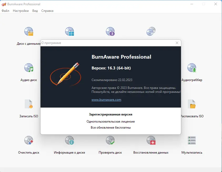 BurnAware — это мощная и при этом простая в использовании программа для записи и копирования дисков различных форматов. Она подходит как для опытных пользователей, так и для новичков, предлагая широкий набор функций для работы с CD, DVD, Blu-Ray и HD-DVD. Благодаря интуитивному интерфейсу и поддержке множества языков, включая русский, программа позволяет быстро и эффективно создавать резервные копии, записывать мультимедийные файлы и клонировать носители. BurnAware — отличный выбор для тех, кто ищет бесплатное решение для работы с образами и дисками.