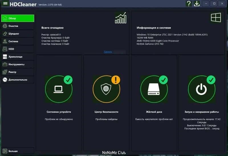 - Возможность очистки системы от лишних программ и файлов