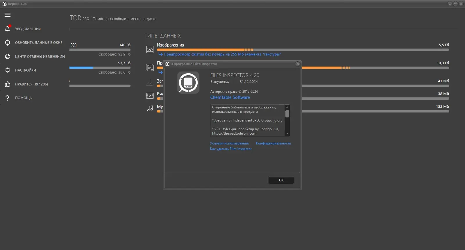 Files Inspector — это мощное программное обеспечение для оптимизации дискового пространства, предназначенное для быстрого поиска и удаления ненужных файлов, программ и данных, которые занимают место на жестком диске. С помощью этой программы можно легко освободить пространство, избавившись от временных файлов, фильмов, загруженных данных и устаревших приложений, не прибегая к сложным инструментам. Она подойдет как для новичков, так и для опытных пользователей, стремящихся повысить производительность системы.