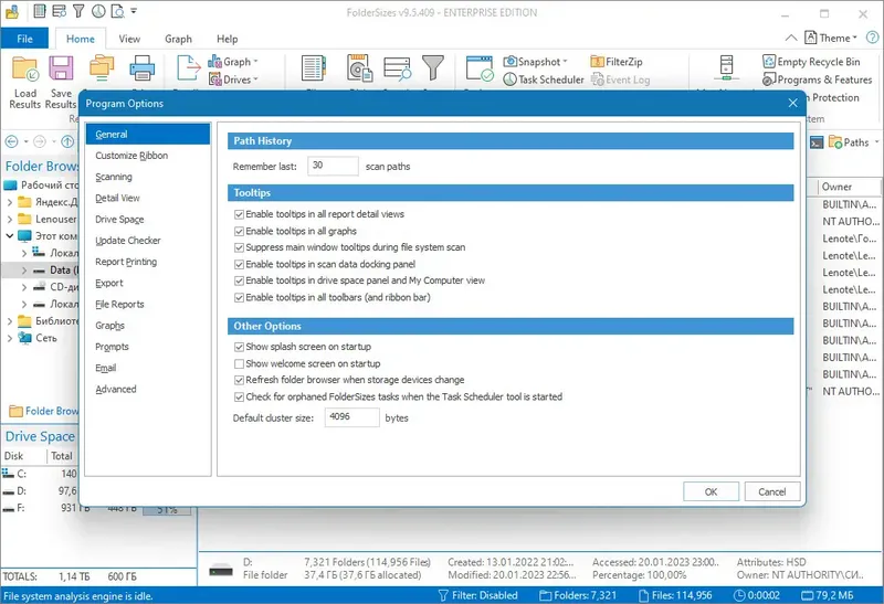 - Интеграция с контекстным меню Windows для быстрого запуска и анализа выбранных папок.