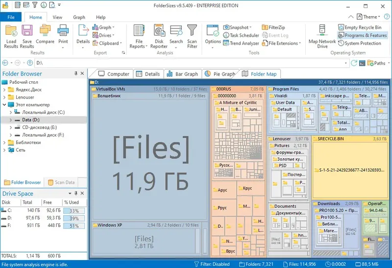 FolderSizes — это универсальное решение для работы с жестким диском, которое позволяет не только определить объем свободного места, но и глубоко анализировать распределение данных. Программа использует технологию TreeMap для отображения иерархической структуры папок, что делает визуализацию максимально понятной и информативной. Она подходит для системных администраторов, ИТ-специалистов и пользователей, желающих эффективно управлять дисковым пространством, избегая его переполнения и потери данных.