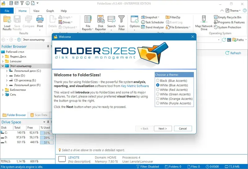 FolderSizes — это мощное программное обеспечение для анализа и управления дисковым пространством. С его помощью можно быстро определить, сколько свободного места осталось на жестком диске, а также получить подробную информацию о размерах папок и файлов по каждому разделу. Благодаря наглядным диаграммам и расширенным отчетам программа значительно упрощает поиск больших и устаревших файлов, освобождая ценное пространство и повышая производительность системы.
