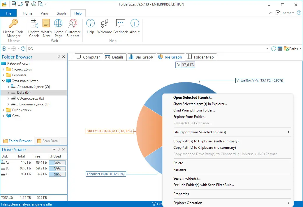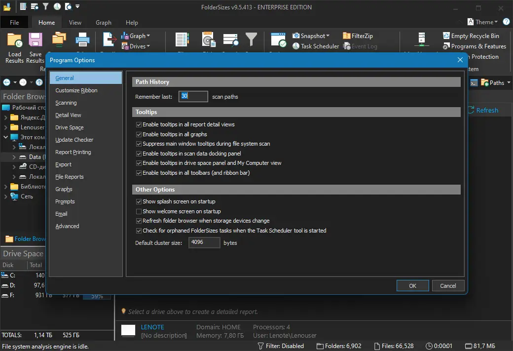 FolderSizes — это универсальное решение для работы с жестким диском, которое предоставляет подробную информацию о размере папок и файлов по каждому разделу. Благодаря иерархической структуре отображения данных и встроенной системе визуализации, пользователи получают ясное представление о распределении данных. В программе реализованы функции экспорта отчетов в различные форматы, такие как HTML, XML, CSV и PDF, что облегчает обмен информацией и дальнейший анализ. Также она включает мощные инструменты поиска и фильтрации, что позволяет быстро находить и управлять файлами, занимая значительную часть дискового пространства.