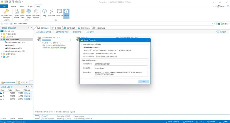 FolderSizes — это мощное программное обеспечение для анализа и управления дисковым пространством. С помощью этой программы можно быстро определить, сколько свободного места осталось на жестком диске, а также получить подробную информацию о размерах папок и файлов по каждому разделу. Визуальные диаграммы и отчеты позволяют легко понять структуру данных и выявить файлы, которые занимают наибольшее пространство. Это решение подходит для системных администраторов и пользователей, желающих эффективно контролировать использование диска.