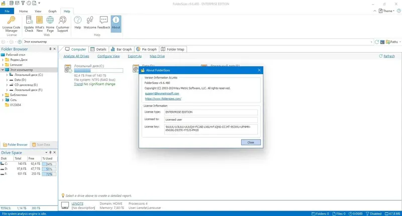 Загрузите FolderSizes 9.3 на русском языке, чтобы начать эффективное управление дисковым пространством. Можно использовать как в виде портативной версии, так и установить на систему для полноценного функционирования. Для активации программы потребуется зарегистрировать ее ключом из кейгена, что обеспечит доступ к полному набору функций без ограничений. Программа совместима с различными версиями Windows и позволяет быстро получать детальную информацию о состоянии жесткого диска.