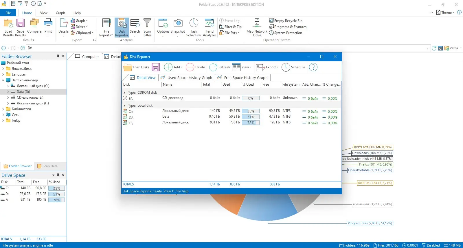 FolderSizes — это мощная программа для анализа и управления дисковым пространством, которая позволяет определить объем свободного места на жестком диске, а также получить подробную информацию о размерах папок и файлов в различных разделах. Благодаря наглядным диаграммам и расширенным возможностям фильтрации, она помогает быстро найти и удалить ненужные файлы, освобождая ценное пространство и повышая производительность системы. Удобный интерфейс и поддержка автоматизированных отчетов делают эту утилиту незаменимой для системных администраторов и пользователей, желающих оптимизировать работу своих компьютеров.