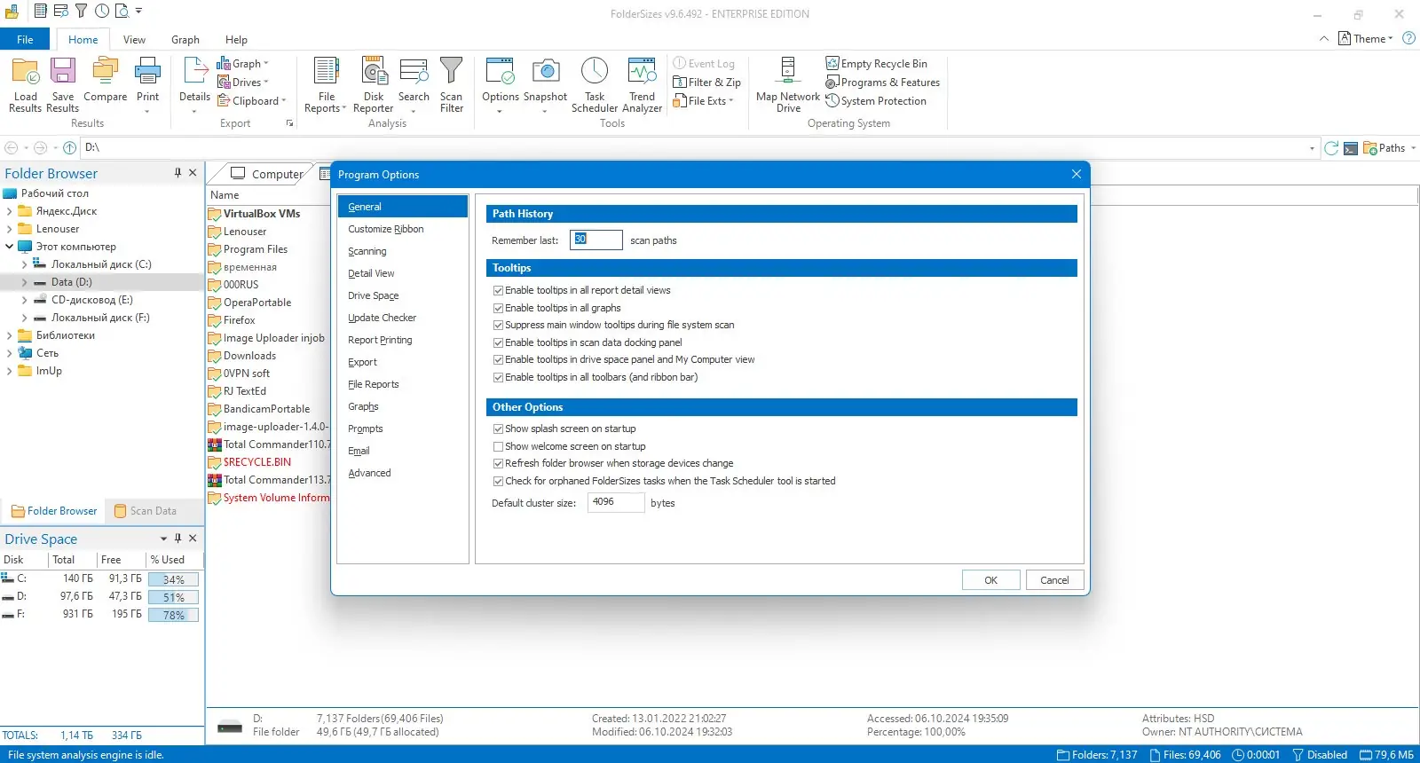 FolderSizes — это универсальный инструмент для анализа дискового пространства с множеством функций и гибкими настройками. Он подходит как для профессиональных системных администраторов, так и для обычных пользователей, желающих освободить место на жестком диске. Благодаря визуализации данных и расширенным возможностям поиска, программа значительно ускоряет процесс оптимизации системы.