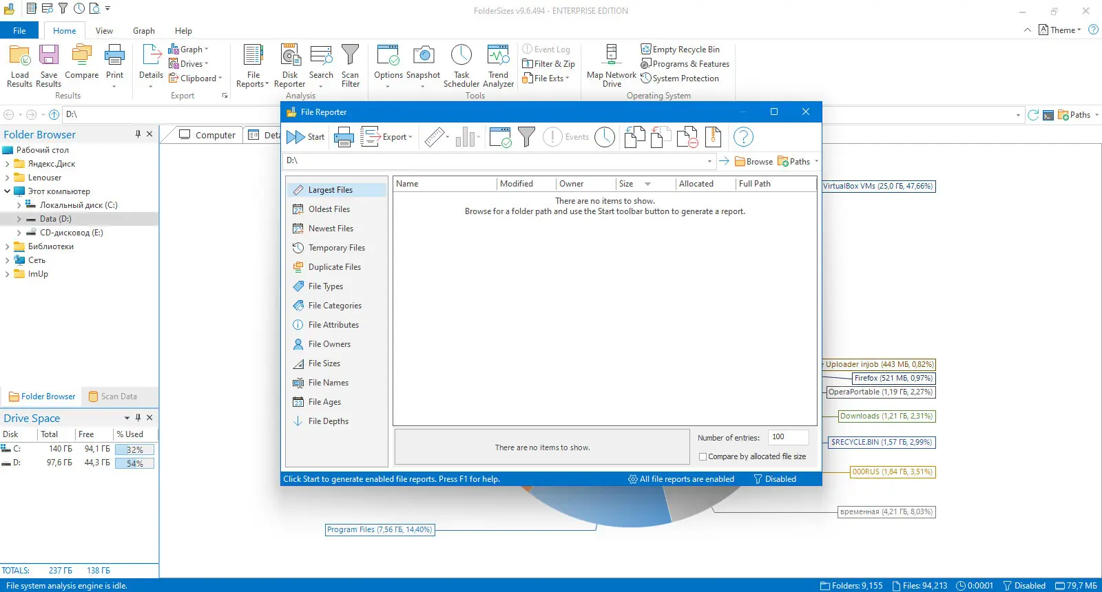 - Подробные отчеты о размере папок и файлов с возможностью настройки отображения