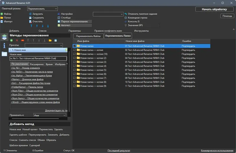 Advanced Renamer — это популярная программа, которая предлагает расширенные возможности для переименования файлов и папок. В новых версиях реализована поддержка новых тегов, что позволяет работать с мультимедийными файлами и изображениями, используя метаданные и EXIF-данные. Интуитивный интерфейс и множество автоматизированных методов делают этот софт удобным как для профессиональных пользователей, так и для новичков. Утилита позволяет создавать сложные сценарии переименования, присваивать системные атрибуты и метки, а также автоматизировать перенос и копирование элементов по заданным алгоритмам.