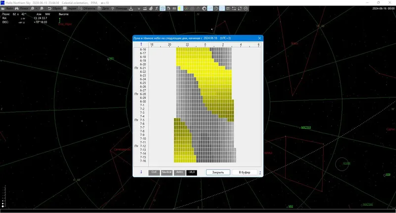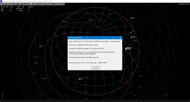 Hallo Northern Sky (HNSKY) — это профессиональный планетарий, созданный для любителей астрономии и профессиональных исследователей. Программа обладает обширной базой данных, включающей информацию о более 4,5 миллионах звезд до 12,5 звездной величины и более 30 тысяч объектов неба, таких как галактики, туманности и планеты. Встроенные каталоги, такие как USNO UCAC4 и GSC 1.2, позволяют отображать звезды до шестнадцатой величины, а сотни фотографий небесных тел предоставляют визуальное представление. Приложение поддерживает множество языков, в том числе русский, что делает его доступным для широкого круга пользователей. Возможности редактирования базы данных, управление отображением объектов, поиск и получение информации о координатах делают его универсальным инструментом для изучения космоса. Также HNSKY может управлять телескопами через интерфейс ASCOM, что значительно расширяет его функционал.