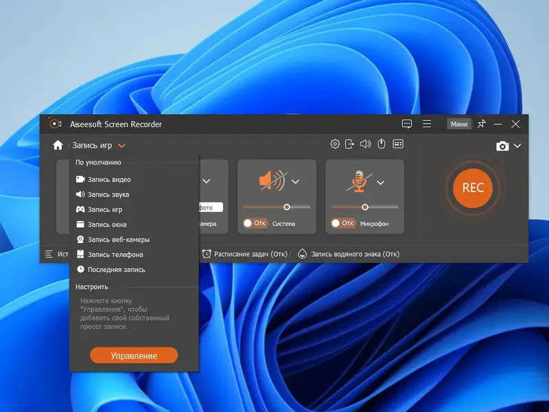 - Поддержка записи звука с микрофона и системных аудиодорожек;